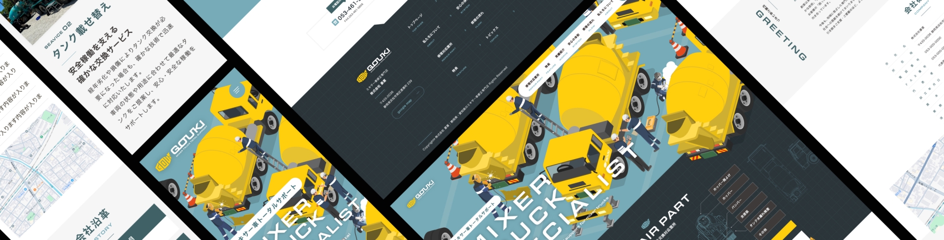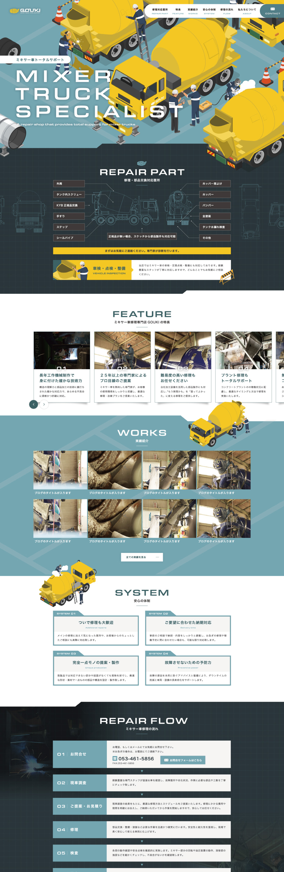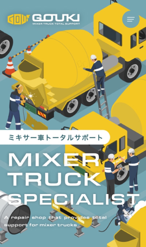 ミキサー車修正専門店としての技術力と信頼感を、イラストをメインに構成して表現。
